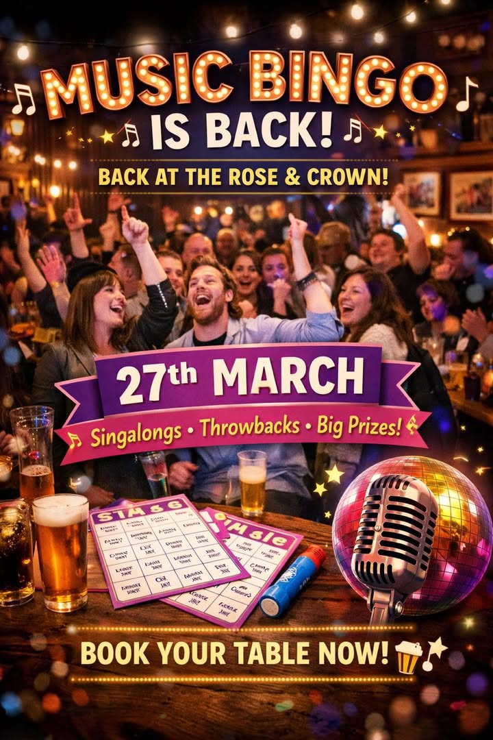 Grab your mates, warm up those singing voices and let’s make a night of it! 🍻🎤 #MusicBingo #RoseAndCrown #PubNight #BingoWithABeat