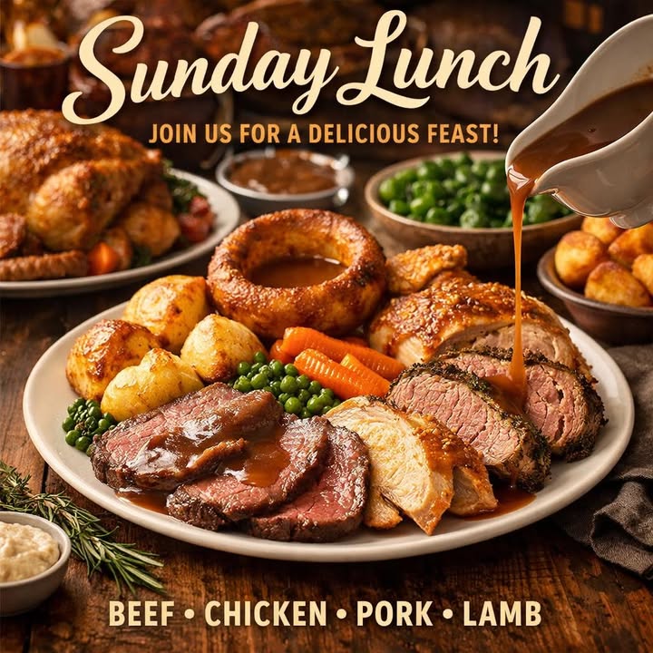 Choose from beef, chicken, pork or lamb – all served with the trimmings you know and love! 🥔🥕