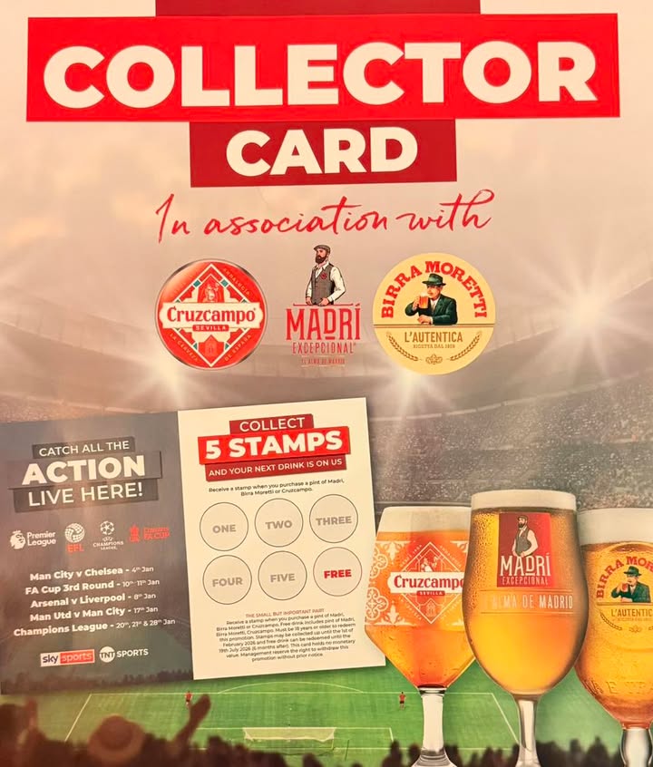 So we’re making it a little easier… in association with Cruzcampo, Madri & Moretti, collect 5 stamps when you buy a Madri or a Moretti and your next one’s on us. Cheers to getting through January together! 🍺