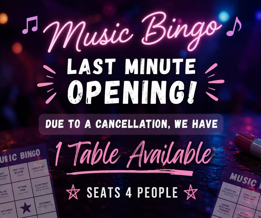 🚨 LAST MINUTE SPACE 🚨 Due to a cancellation, we now have ONE TABLE available for 4 people for Music Bingo! 🎶 These nights always sell out fast, so this is your chance to grab a spot! 👀 Message us ASAP to book before it’s gone! 💨