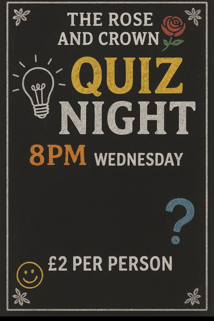 It’s Quiz Night this Wednesday at The Rose and Crown! 🧠✨ Join us from 8PM — just £2 per person. Bring your best team, grab a drink, and see if you can claim the top spot! 🍻
