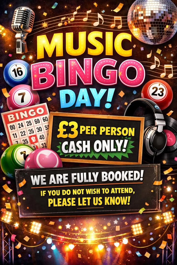 🎶 MUSIC BINGO DAY 🎶 What a night this is going to be! 🕺💃 Join us for an evening full of great tunes, laughs and prizes! 💷 £3 per person – cash only ⚠️ We are now FULLY BOOKED! If you’ve booked and can no longer make it, please let us know so we can offer your table to someone else 🙏 Let the music play… 🎧🎤 #MusicBingo #FullyBooked #GoodVibesOnly